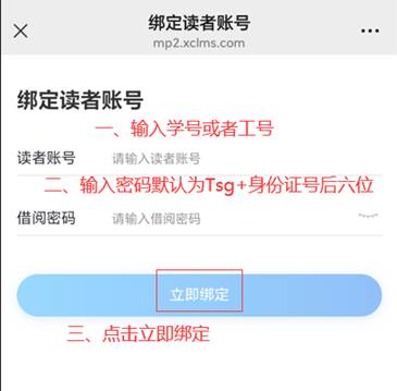 3、输入读者账号(学号或工号)和借阅密码(默认为Tsg+身份证号后六位),然后点击立即绑定。