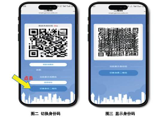 (二)点击“二维码”页面下方“切换身份二维码”(图二),即可调出身份码(图三)。