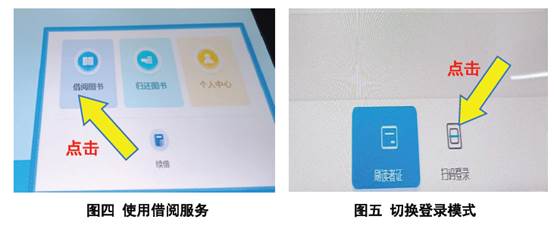 (一)在任意自助借还机上点击“借阅图书”(图四),进入服务界面后点击下方“扫码登录”切换模式(图五)。