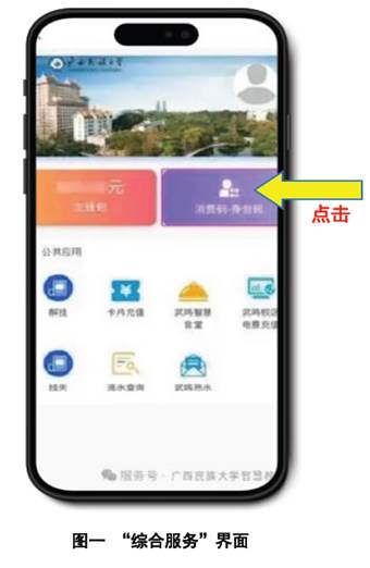 (一)登录微信“广西民族大学智慧校园”公众号,进入“综合服务”界面并点击“消费码-身份码”(图一)。