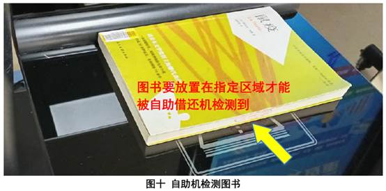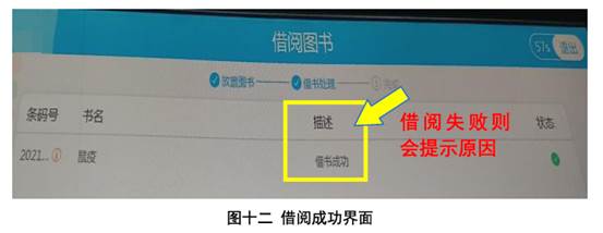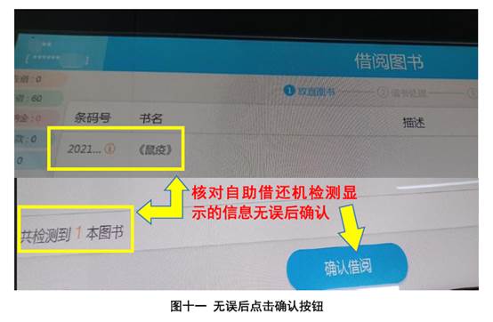 (四)将图书放在自助借还机指定区域检测(图十),核对显示的书名和册数无误后点击“确认借阅”(图十一)。借阅成功会在界面“描述”中显示(图十二),失败则提示原因;借阅失败的图书请交大堂值班老师处理。