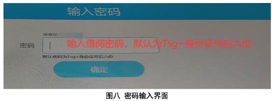(三)扫码成功后界面出现借阅密码输入框,默认为 Tsg+身份证号后六位(图八)。正确输入后点击“确定”,进入借阅图书界面(图九)按提示操作。