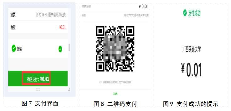 点击【确定】后弹出“数智财务平台”界面,确认金额并点击【微信支付】(图7),使用微信扫描出现的二维码进行支付(图8)。支付成功后,缴费界面会出现支付成功的提示(图9)。