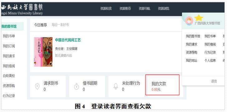 成功登录读者界面,即可查看【我的欠款】信息(图4)。
