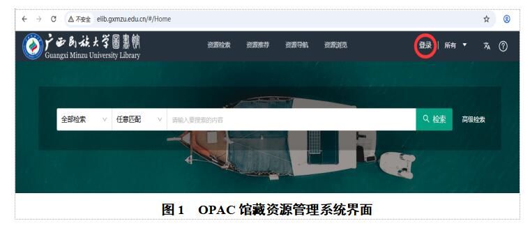 (一)进入图书馆网站首页点击【我的图书馆】,或直接输入网址【https://elib.gxmzu.edu.cn/#/home】,进入OPAC馆藏资源管理系统界面后,点击右上角【登录】(图1)。